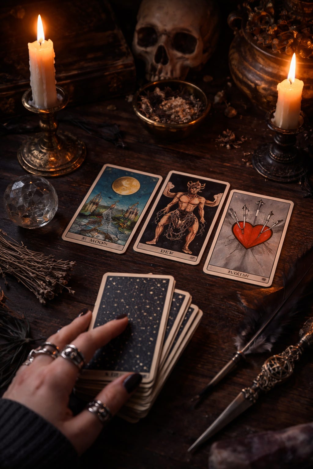 For example, drawing The Devil may point toward attachment, compulsion, or control. You explore the theme without retraumatizing your body.